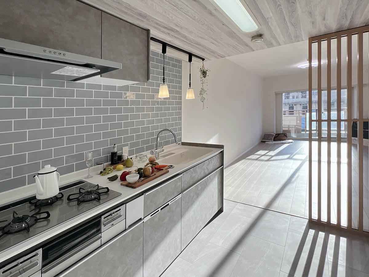 インテリア格子とブルーアクアタイルがおしゃれなキッチン。